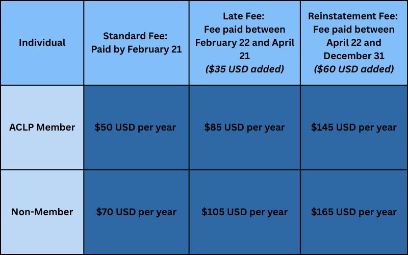 The following shows the annual certification maintenance fees for both ACLP Members and non-members.