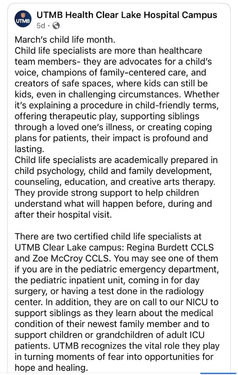While each approach looks a little different, these snapshots reflect a shared commitment to supporting children and families through meaningful, compassionate care. Here’s a look at how Child Life Month was recognized across the field.