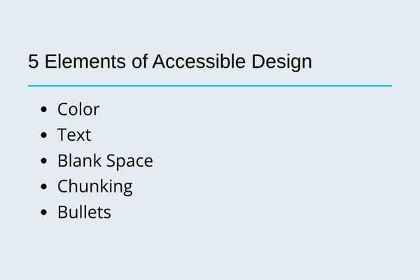- Use an online “contrast checker” tool to make sure your color combinations are highly legible (Mendez, n.d.).