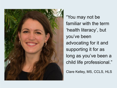 Every day, you support patients’ and families’ personal health literacy, and child life departments are a huge part of organizational health literacy.
